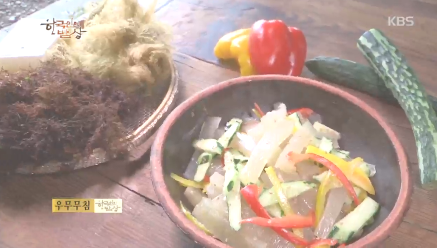 ‘우무무침’은 파프리카, 오이 등 아삭한 채소에 새콤한 양념을 넣고 잘 무친 뒤에 우무채를 마지막에 넣고 살짝 무쳐줍니다.