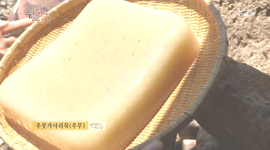 ‘우뭇가사리묵(우무)’는 잘 씻어서 물을 솥에 넣고 우뭇가사리를 넣고 푹 끓입니다. 그리고 채에 내려서 걸러 물만 내려준 뒤에 틀에 넣고 식혀 굳힙니다.