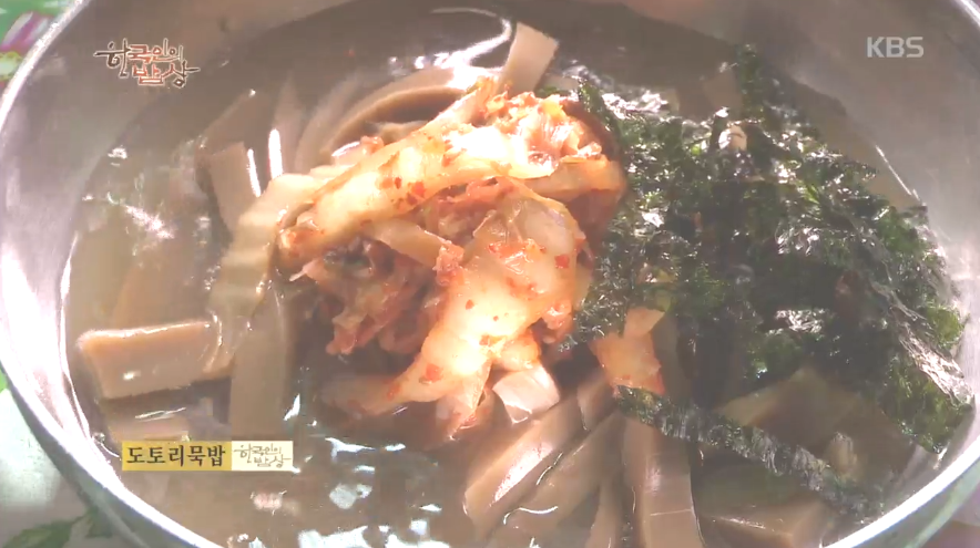 ‘도토리묵밥’은 물에 무, 양파, 멸치, 다시마, 파, 간장을 넣고 끓여줍니다. 묵을 길게 썰어줍니다. 묵은지는 김치국물을 꾹짜서 송송 썰어 파, 다진마늘, 고춧가루, 깨소금, 참기름 등을 넣고 무쳐 준비합니다. 그릇에 묵을 넣고 무친김치와 김을 올리고 식힌 육수를 부어줍니다.