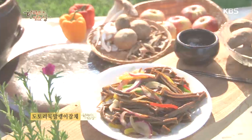 ‘도토리묵말랭이잡채’는 도토리묵을 햇볕에 널어 말린 말랭이를 물에 불립니다. 팬에 양파, 피망, 우엉 등 다 따로 볶아줍니다. 묵말랭이도 가장으로 간을 하면서 잘 볶은 뒤 한번에 다 넣고 섞으면서 한 번 더 볶아줍니다.