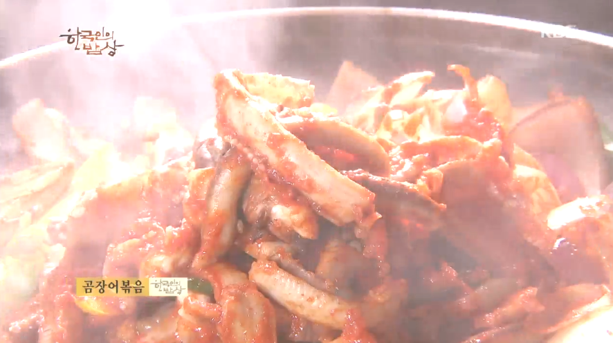 ‘곰장어볶음’은 곰장어의 껍질만 잘 바른 뒤에 살짝 데친 뒤에 냄비에 깔고 양파를 듬뿍 넣고 파, 다진마늘에 매콤한 양념을 넣고 잘 볶아줍니다.