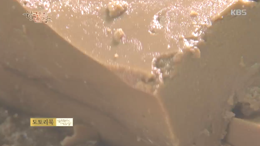 ‘도토리묵’은 도토리가루:물=1:7로 넣고 잘 섞어 준 뒤에 채에 내리면서 고르게 섞어줍니다. 솥에 부은 뒤에 계속 저어줍니다. 그리고 나무주걱을 꽂았을 때 서면 꺼내서 틀에 담아 식힙니다.