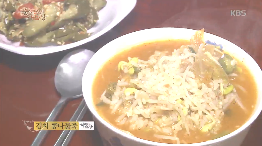 ‘김치 콩나물죽’은 묵은지 송송, 콩나물 듬뿍 넣고 밥을 넣고 푹 끓입니다.