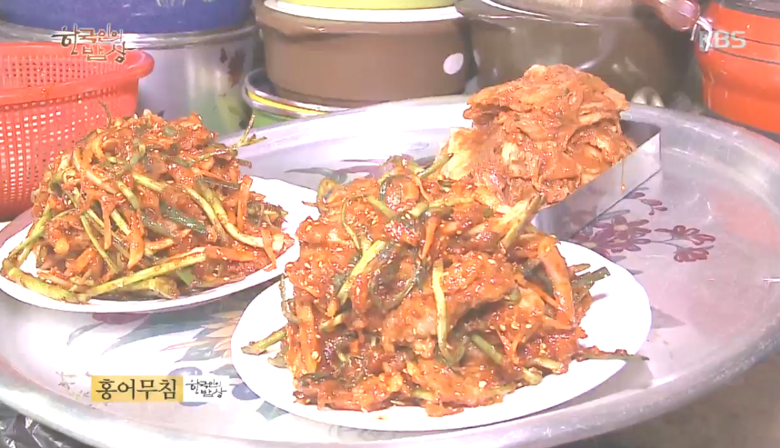 ‘홍어무침’은 잘 삭힌 홍어에 고추장양념을 넣고 잘 무쳐 줍니다. 그리고 미나리, 아삭하게 절인 무, 당근채 등을 넣고 다진마늘, 깨소금 등을 넣고 잘 무쳐 줍니다. 홍어무침과 수육을 같이 싸서 먹습니다.