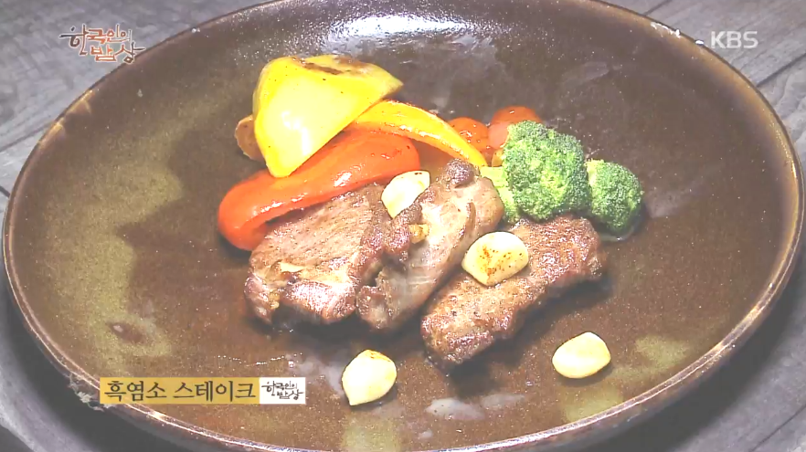 ‘흑염소 스테이크’는 고기를 결 반대로 두툼하게 썰고 소금을 뿌리고 후추로 간을 한 뒤에 팬에 기름을 듬뿍 넣고 뜨겁게 달군 다음 고기를 올리고 기름을 뿌려주면서 굽고 마지막에 버터를 넣고 구워 풍미를 냅니다.