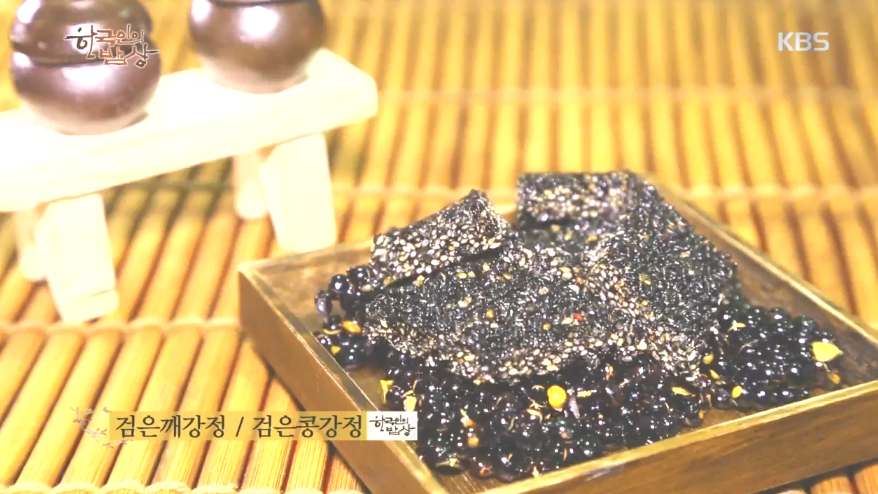 ‘검은깨강정’은 물엿이 끓으면 잘 저어서 주걱을 들었을 때 엿빨이 스면 잘 볶은 검정깨에 부어서 잘 저으면서 적당양 넣은 뒤에 네모지게 모양을 잡고 잘 쳐서 평평히 만든 뒤에 완전히 굳기 전에 잘라줍니다. ‘검은콩강정’도 같은 방법으로 만듭니다.