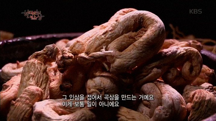 ‘곡삼’은 인삼껍질을 다 깍고 삼을 접어서 말립니다. 예전에는 다 이렇게 했지만 현재는 홍삼도 만듭니다.