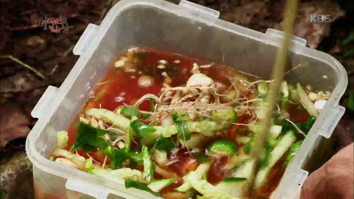 ‘산양삼 오이냉국’은 산을 탈 때 오이냉국을 만들어서 가서 산양삼을 캐 계곡에서 씻어서 넣고 먹습니다.