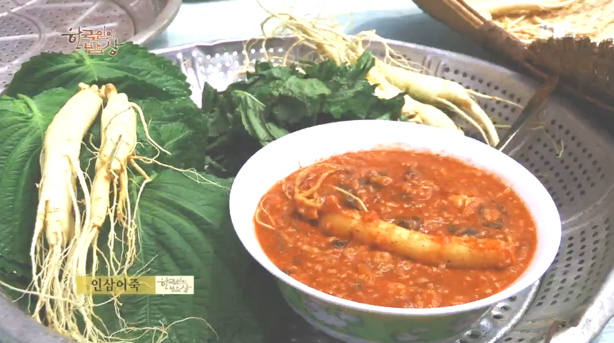‘인삼어죽’은 메기, 꺽정이 등 민물고기를 물에 삶아서 채에 걸러 끓인 다음 고추장, 된장, 고춧가루를 풀어 넣고 끓입니다. 그리고 인삼 한 뿌리 넣고 거기에 수제비를 떠서 넣고 끓입니다.