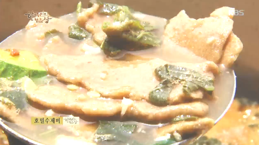 ‘호밀수제비’는 호밀가루에 물을 넣고 반죽을 합니다. 된장물에 애호박 등 야채를 넣고 끓이고 호밀반죽수제비를 떠서 넣고 끓입니다.