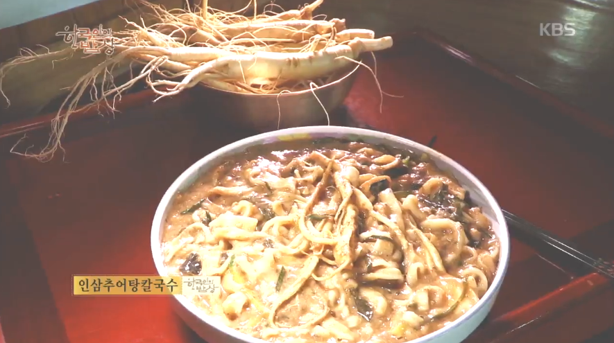 ‘인삼추어탕칼국수’는 미꾸라지를 삶아 채에 걸려 갈아주고 된장, 고추장을 풀어서 끓입니다. 그리고 야채와 함께 인삼을 넣고 끓여줍니다. 그리고 면을 넣어 익힙니다.