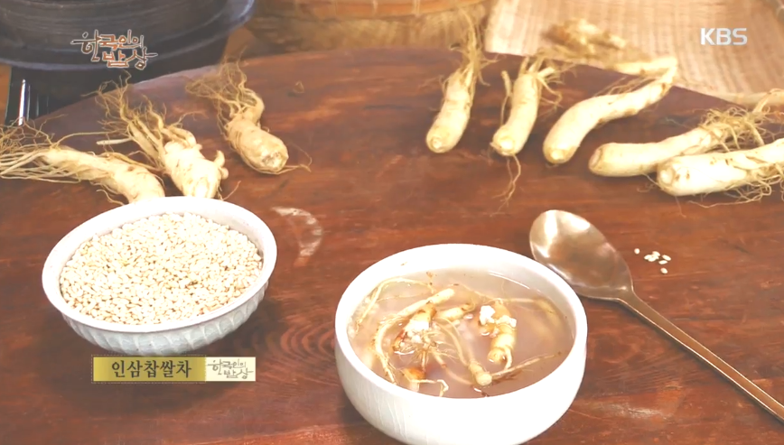 ‘인삼찹쌀차’는 인삼을 부러뜨려서 솥에 삼을 넣어줍니다. 그리고 불린 현미찹쌀을 넣고 물은 부어서 끓입니다. 그리고 국물을 먼저 떠먹습니다.