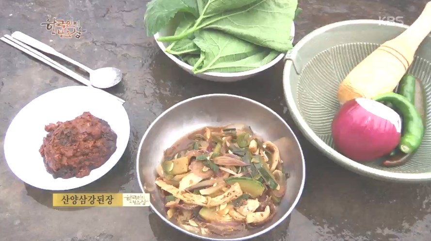 ‘산양삼강된장’은 여러 야채와 된장을 넣고 끓이고 거기에 산양삼을 확으로 갈아서 넣고 조려줍니다.