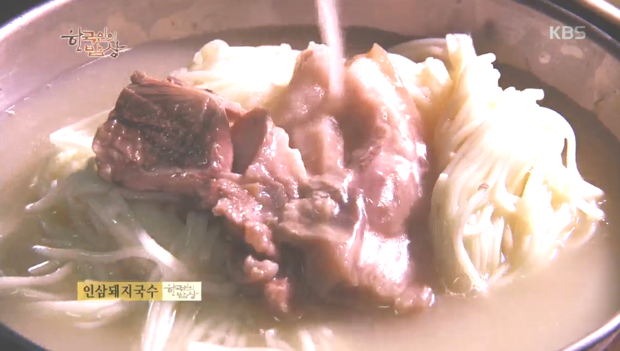 ‘인삼돼지국수’는 솥에 인삼과 족발을 넣고 푹 삶아서 먹기 좋게 자릅니다. 그리고 국수를 삶아 그릇에 담고 국물과 고기를 올립니다.