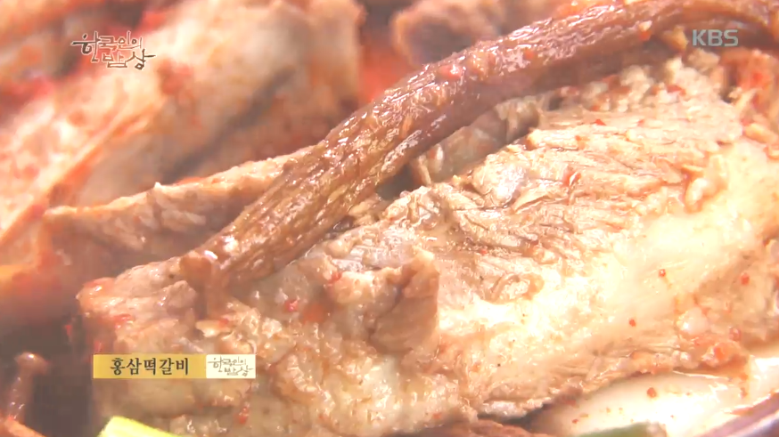 ‘홍삼등갈비’는 돼지등갈비를 데친 뒤 냄비에 넣고 말린 홍삼을 넣은 뒤에 양념장을 풀고 끓이다가 파, 고추, 표고버섯 등을 넣고 끓여줍니다.