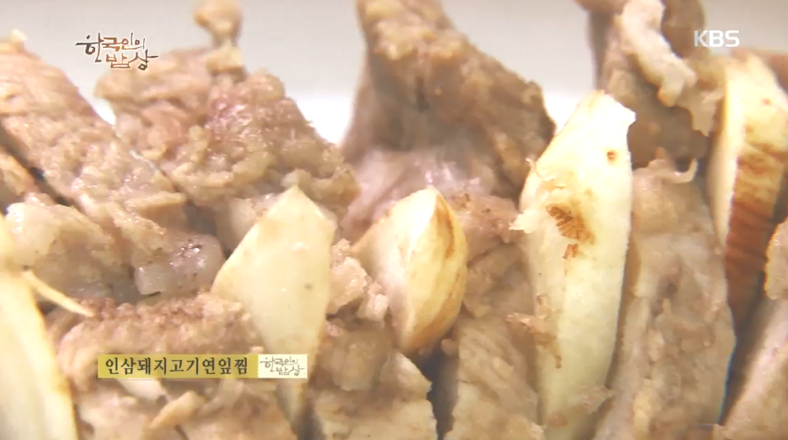 ‘인삼돼지고기연잎찜’은 돼지고기를 넣은 뒤에 삶습니다. 그리고 먹기 좋게 잘라서 연잎에 올리고 사이사이 인삼편을 꼽은 뒤에 싸줍니다. 밑에 물에 약초륵 넣고 끓이다가 찜통 위에 연잎으로 싼 돼지고기를 올려 쪄줍니다.