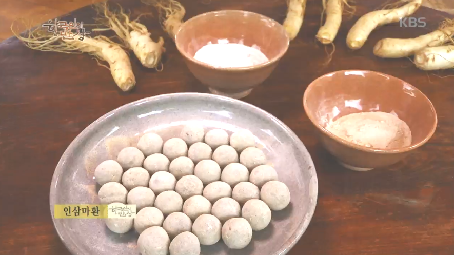 ‘인삼마환’은 인삼을 찜통에 넣고 쪄줍니다. 그리고 햇볕에 말려줍니다. 그리고 9번을 찌고 말리기를 반복한 흑삼가루와 약초가루, 계피가루를 섞고 꿀을 넣고 반죽을 해서 둥글게 말아줍니다. 그리고 겉에 흑삼가루를 뿌려서 잘 묻혀줍니다.