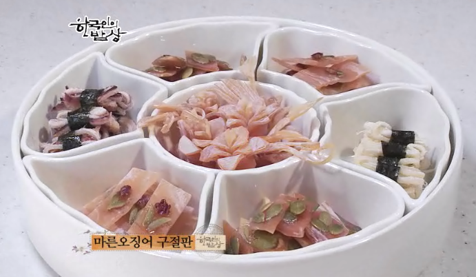 ‘마른오징어 구절판’은 건오징어를 적셔서 단지(항아리) 안에 면보로 싸서 넣어서 보관을 했습니다. 조선시대 마른 오징어는 수라상이나 반가의 큰 상에나 오르던 귀한 음식이였습니다. 마른 것을 상에 올릴 때도 고명을 올리거나 꽃모양으로 만들어서 올렸다고 합니다. 지금고 강릉에서 폐백을 할 때 오림을 한다고 합니다. 이렇게 이쁘게 만들고 남은 오징어는 재활용을 했습니다. 그 만큼 귀한 음식이였기 때문입니다.