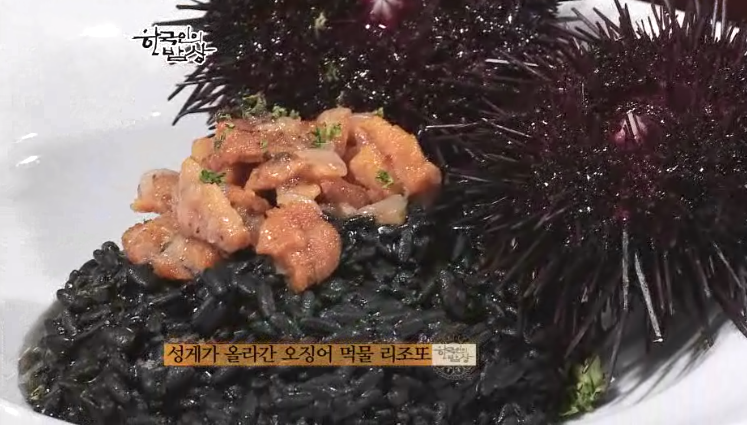 ‘먹물 리조또’는 쌀을 넣고 볶다가 육수대용으로 먹물을 넣고 성게 알을 올립니다. 먹물요리를 먹을 때는 입가에 묻지 않게 조심히 먹어야 합니다.