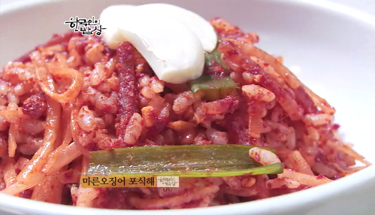 ‘건오징어 식해(마른오징어 포식해)’는 체를 썬 마른 오징어를 엿기름에 섞고 파, 무를 채썰고 거기에 고춧가루 조물조물해서 좁쌀을 넣고 무쳐서 3일정도 숙성을 한 뒤에 부드러운 상태로 오징어의 쫄깃한 맛을 즐겨왔습니다.