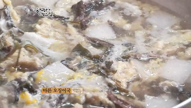 ‘마른 오징어국’은 오징어를 체 썬 것을 계란 푼 물에 옷을 입히고 끊는 물에 무를 나박하게 썰어 넣고 끊이다가 옷입은 오징어를 한가닥씩 넣고 다시마를 채를쳐서 넣고 끊입니다.