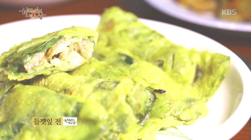 ‘깻잎전’은 다진 돼지고기, 다진양파, 밀가루, 깨 등을 넣고 잘 비빈 뒤에 팬에 식용유를 두르고 볶아줍니다(깻잎보다 안익기 때문에). 들깨잎에 치자물로 반죽한 물을 묻혀서 올리고 소를 넣어 반을 접어 부쳐줍니다.