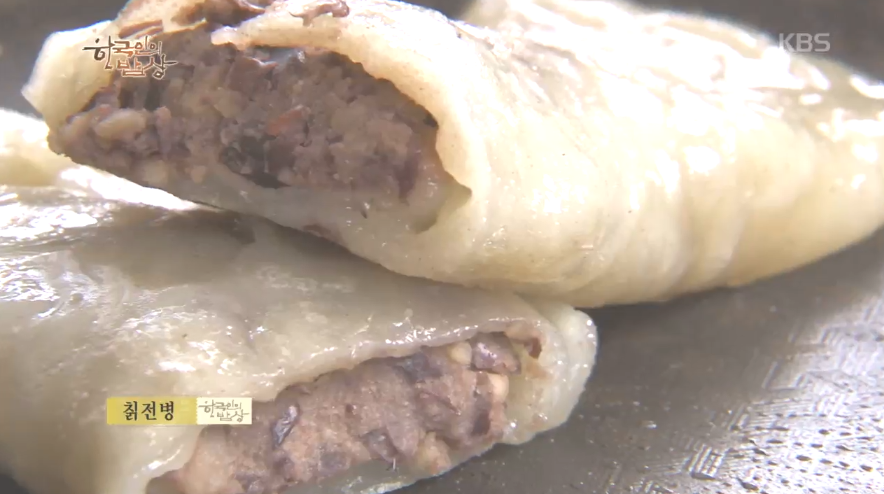 ‘칡전병’은 칡가루에 물을 섞어주고 소금을 조금 넣고 저어서 반죽을 만든 뒤에 전병을 부칩니다.그리고 팥을 삶아 소를 만들어서 전병에 넣고 둘둘 말아서 굽습니다.