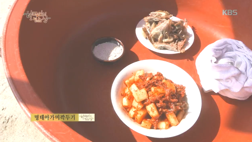 ‘명태아가미 깍두기’는 아가미에 엿기름을 뿌려주고 고춧가루양념을 버무린 뒤에 깍뚝썬 무와 섞어줍니다.