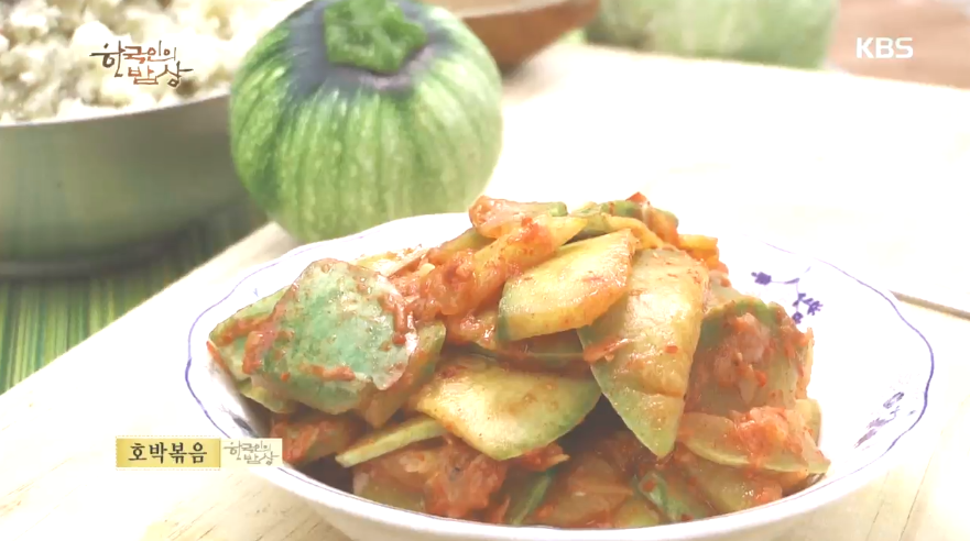 ‘호박볶음’은 호박은 나박하게 썰어서 새우젓, 고춧가루를 넣고 섞은 뒤에 잔불에 올려 볶아줍니다.