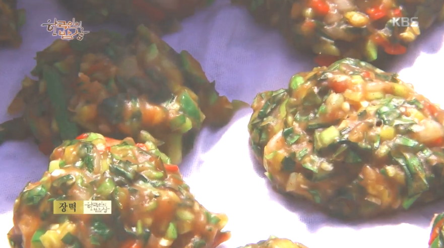 ‘장떡’은 애호박, 깻잎, 청양고추, 홍고추 등 잘게 썰어 넣고 밀가루, 고추장, 된장을 넣어서 섞어 둥글 납짝하게 빚어서 찜통에 넣고 쪄줍니다.