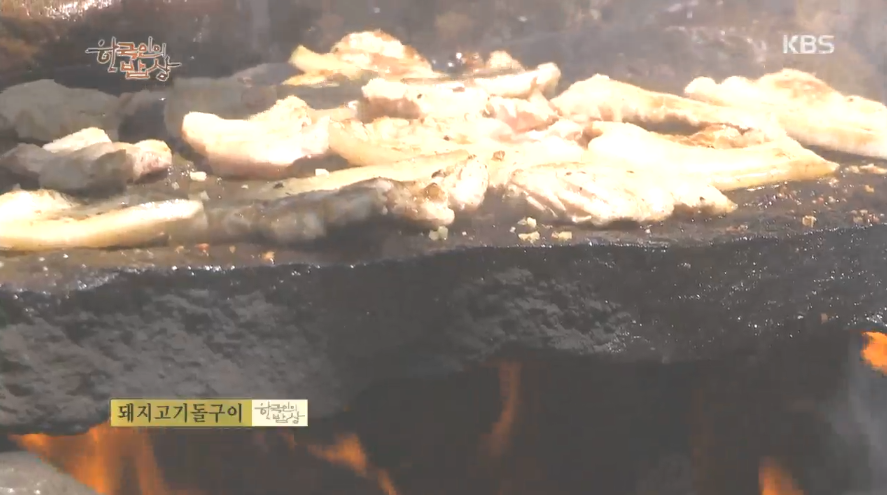 ‘돼지고기 돌구이’는 돌판에 돼지기름으로 잘 비벼서 발라서 이물질을 없애고 돼지고기 올리고 소금을 뿌려 구워먹습니다. 그리고 묵은지를 구워 같이 먹습니다.