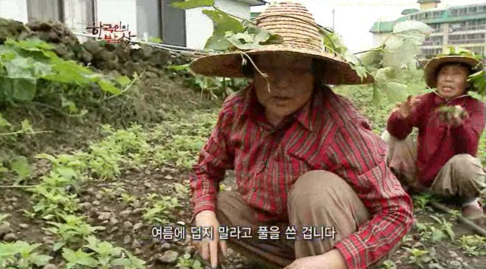 김을 맬 때 덥지말라고 풀을 모자에 두르고 노동요를 불렀다고 합니다.
