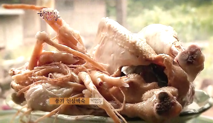 ‘풍기인삼백숙’은 솥에 토종닭을 넣고 팔뚝만한 인삼 넣고 마늘, 대추넣고 불을 때서 은근한 화력의 장작 4시간을 푹 끊입니다. 건더기는 건져 먹고 찹쌀은 씻어서 4시간 고아낸 삼계탕 안에 넣고 끊입니다.