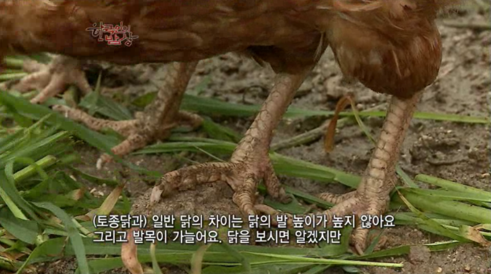 일반 닭과 토종닭의 차이는 닭의 발 높이가 높지 않고 발목이 가늡니다. 벼슬은 솟아나는 게 적고 긴 차이가 있습니다. 또 토종닭은 잡식을 하기 때문에 고기를 주면 난리가 난다고 합니다. 한 번 싸우면 피를 보는데 피를 본 닭은 오래 못산다고 합니다. 토종닭은 살이 적은 대신 육질이 쫄깃합니다. 방목해서 키우기 때문입니다.