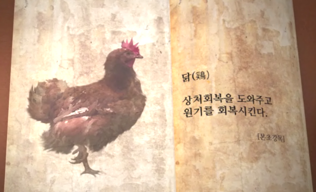 우리는 언제부터 닭을 먹기 시작했을까요? 『삼국유사』에 보면 김알지를 얻는데 닭이 숲 속에서 울었다 해서 국호를 계림이라고 하였고 고구려 ‘무용초’ 벽화를 보아 꽤 오래 전부터 우리와 함께였던 것 같습니다. 또한 명나라 약학서 『본초강목』에서 ‘조선에는 꼬리가 3~4척 되는 긴 꼬리 닭이 있는데 맛과 살이 다른 닭보다 뛰어나다.’라는 것을 볼 수 있습니다.