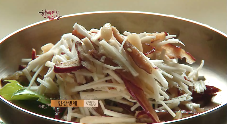 ‘인삼생채’는 인삼을 체 썰고, 대추체, 잣을 넣고 그 위에 식초물로 간을 합니다.