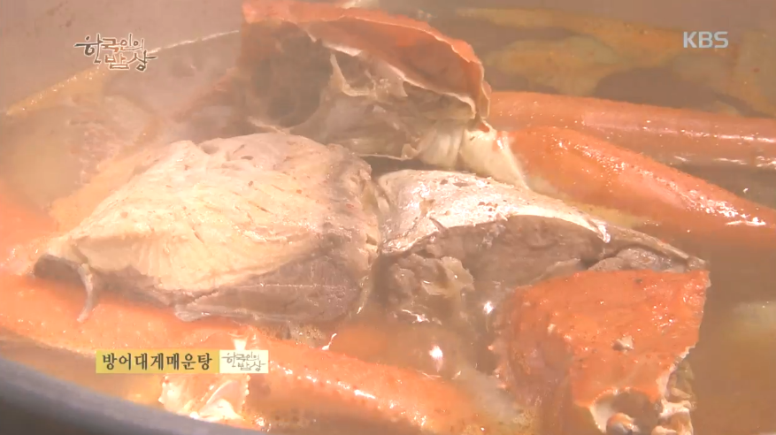 ‘방어대게매운탕’은 물에 무, 방어 내장과 대가리, 대게를 넣고 고춧가루 양념을 해서 끓입니다.