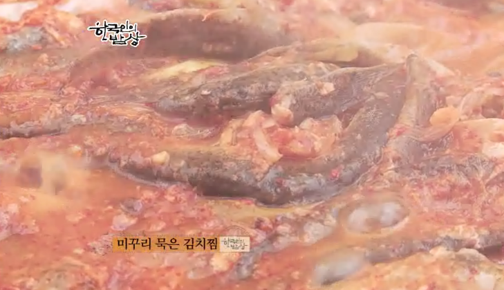 ‘미꾸리 묵은 김치찜’은 묵은지를 크게 썰어서 밑에 깔고 산 미꾸리를 통재로 넣고 칼칼한 고추장 양념장 넣고 다진마늘을 듬뿍 넣고 파를 넣어 끊입니다. 그리고 깻잎에 미꾸리와 김치를 싸서 먹습니다.
