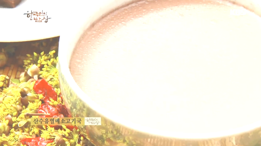 ‘산수유열매소고기국’은 홍두께살과 산수유 열매를 물에 넣고 삶아아서 국물을 먹습니다.