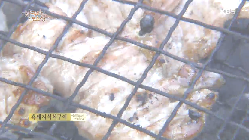‘흑돼지석쇠구이’는 돼지를 잡는 날이면 국이나 편육을 끓일 때 잔불을 꺼내서 석쇠에 돼지고기를 올리고 굵은 소금을 뿌려 구워줍니다.