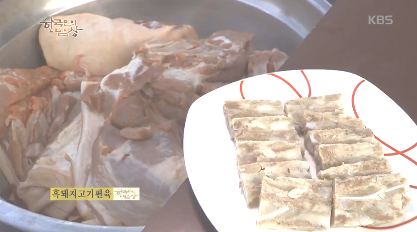 ‘흑돼지고기편육’은 끓는 물에 된장을 풀어서 뼈, 잡고기를 넣고 삶아줍니다. 그리고 면보에 넣고 방망이로 찧어서 으깨줍니다. 그리고 돌로 눌러서 하루 반나절을 식힙니다. 그리고 먹기 좋게 썰어서 먹습니다.