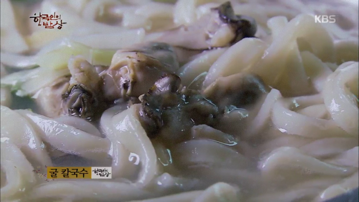 ‘굴칼국수’는 끓는 물에 굴을 넣고 끓이다가 칼국수를 넣고 끓입니다. 그리고 면이 동동 뜨면 파, 다진마늘을 넣고 간을 합니다.