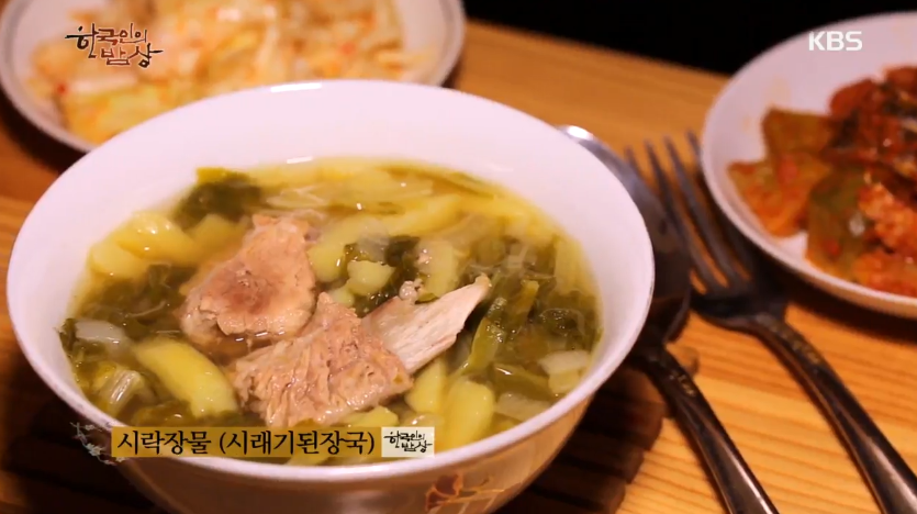 ‘시락장물(시래기된장국)’은 물에 돼지고기를 넣고 끓이다가 된장을 풀고 데친 배추, 편마늘, 양파채 등을 넣고 끓입니다.