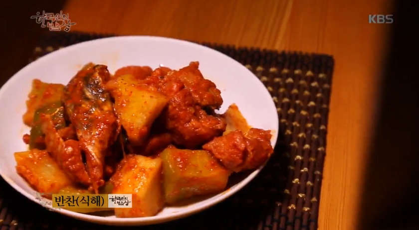 ‘반찬(식해)’는 민물고기를 손질해서 토막을 낸 뒤 소금을 뿌려 주물주물 해줍니다. 그리고 절인 무와 섞어, 고춧가루, 양파채 등을 넣고 버무려서 일주일 정도 숙성을 시킵니다. 물에 밥말아서 올려서 먹는다고 합니다.