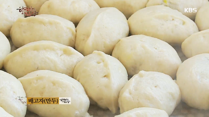 ‘배고자(만두)’는 밀가루 반죽을 해서 만두피를 좀 두껍게 해서 소를 꽉차게 넣고 빚어 찜통에 넣고 쪄줍니다.