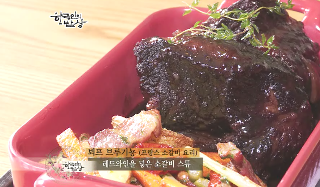 ‘뵈프브루기뇽’은 당근, 양파, 파, 셀러리를 토막으로 자르고 마늘을 칼로 찧어서 향신료와 밑에 깔고 갈비를 올리고 허브 등을 넣고 포도주를 넣어 고기를 재어둡니다. 그리고 갈비는 꺼내서 소금으로 간을 해서 고기를 굽고 당근, 양파, 통후추 베이컨 등을 넣고 볶다가 재울 때 썼던 포도주를 걸러서 넣어 끊이고 타임, 파슬리줄기, 월계수 잎을 파 잎에 싸서 실로 묶은 것을 넣어 잡내를 잡아주기도 하고 포도주의 향에다가 향신료의 향이 우러나게 해주면 고기와 굉장히 잘 어울리는 그런 향이 난답니다. 그리고 비프육수를 부어 다시 한 번 끊여줍니다.