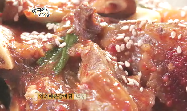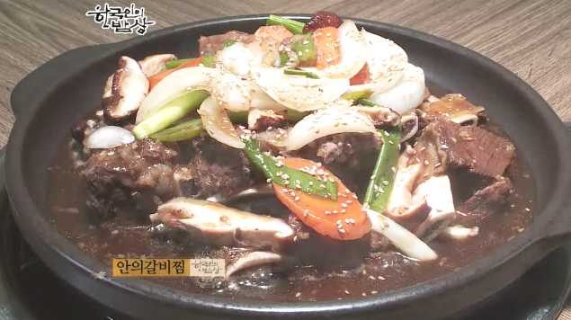 ‘안의갈비찜’은 냄비에 갈비를 넣고 육수를 넣은 뒤 끊이다가 따른 갈비찜처럼 진한 간장양념이 아니라, 심심하게 합니다. 양념장을 흑설탕을 넣어 따로 만들고 끊는 갈비에 붓습니다. 그리고 표고버섯, 파, 양파, 당근, 고추를 넣어 살짝만 조려냅니다. 일반 갈비찜과 전골의 중간이라고 합니다. 그리고 고춧가루를 넣어 조린 ‘매운갈비찜’도 있습니다.