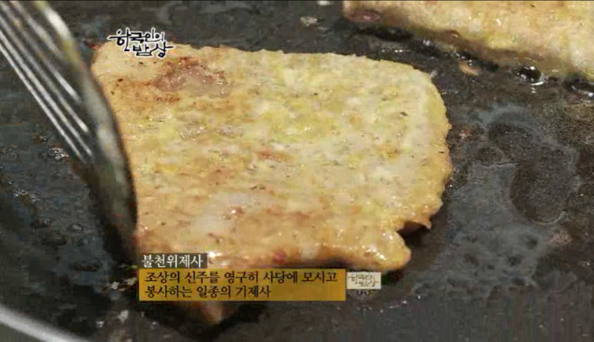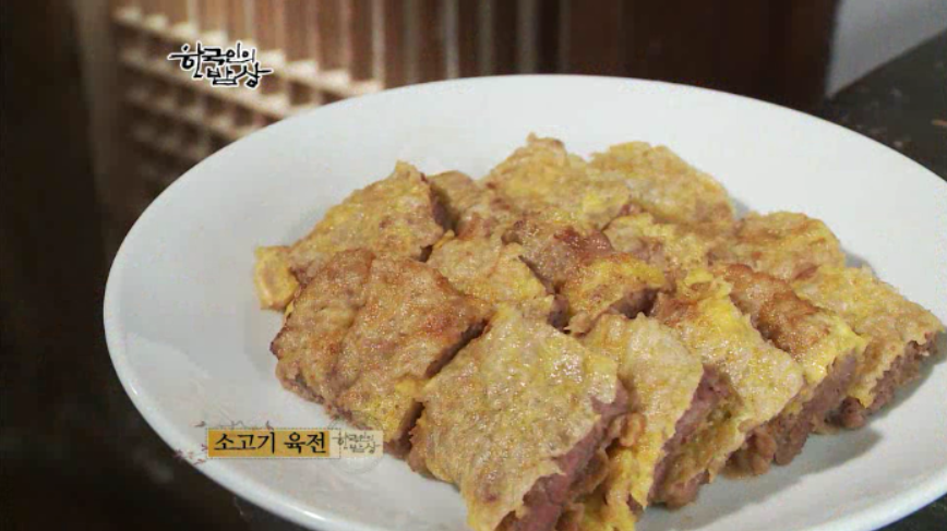 ‘소고기육전’은 쇠고기를 잘게 다지듯이 계속 칼집을 냅니다. 양념장에 잘 재어 밑간이 베인 고기에 밀가루를 골고루 잘 묻힌 뒤에 계란옷을 입혀 지집니다. 제사에 꼭 올라갑니다.