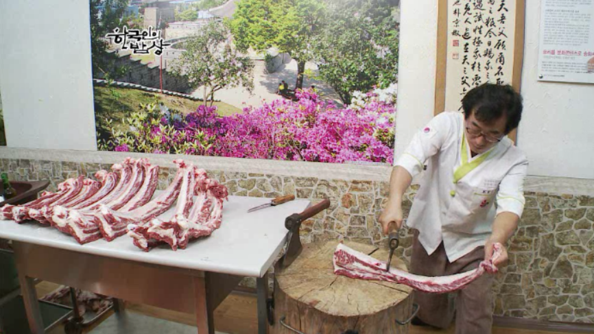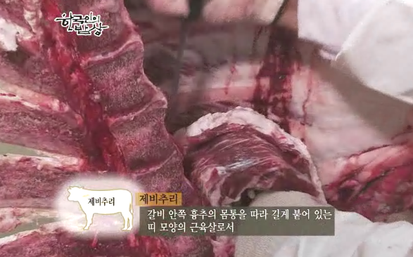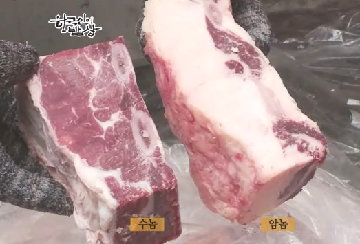 다른지역보다 갈비덩어리가 컸다고 합니다. 우선 갈비를 짝으로 가지고 와서 크게 자릅니다. 암놈과 수놈을 구분해서 쓰는데 암놈은 기름기가 많아 부드러워서 탕용으로 많이 나가고 수놈은 살이 많아 찜용으로 많이 나갑니다.