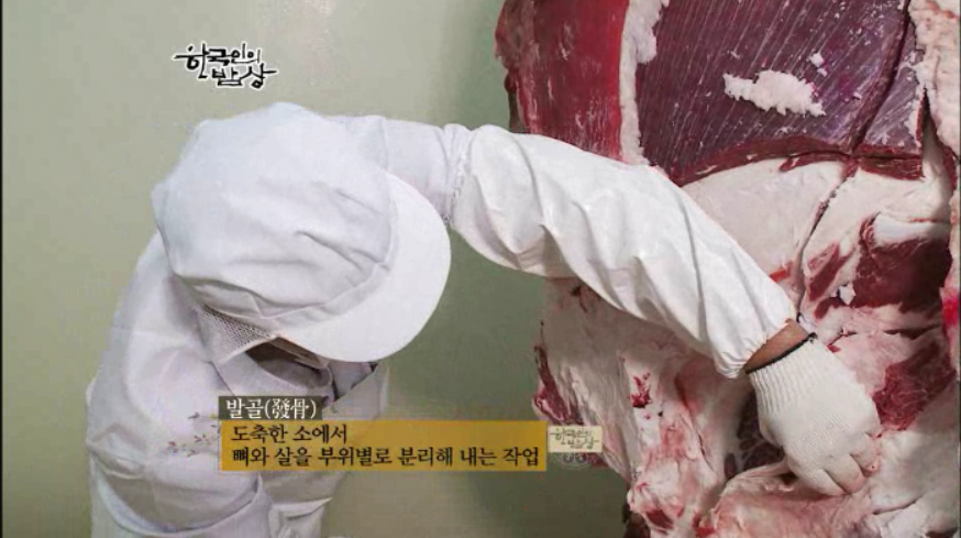 소에서 갈비를 어떻게 구분해 낼까요? 도축된 소에서 살과 뼈를 부위별로 분리해 내는 작업을 ‘발골’이라고 합니다. 발골은 날렵한 칼솜씨와 정확함이 필요로하는 작업입니다. 소고기는 정육과 지방, 뼈로 구분이 됩니다. 뼈에 살을 붙이는 것과 지방에 살을 붙이는 것과 정상적으로 완벽하게 칼질을 하는 것의 차이는 어마어마한 차이라고 할 수 있습니다. 지방은 가격이 삼백 원부터 시작되고 고기는 최하가 만 원부터 십만원까지 합니다. 칼질 한 번 잘하고 잘못하면 두 세사람의 인건비가 왔다 갔다 합니다.